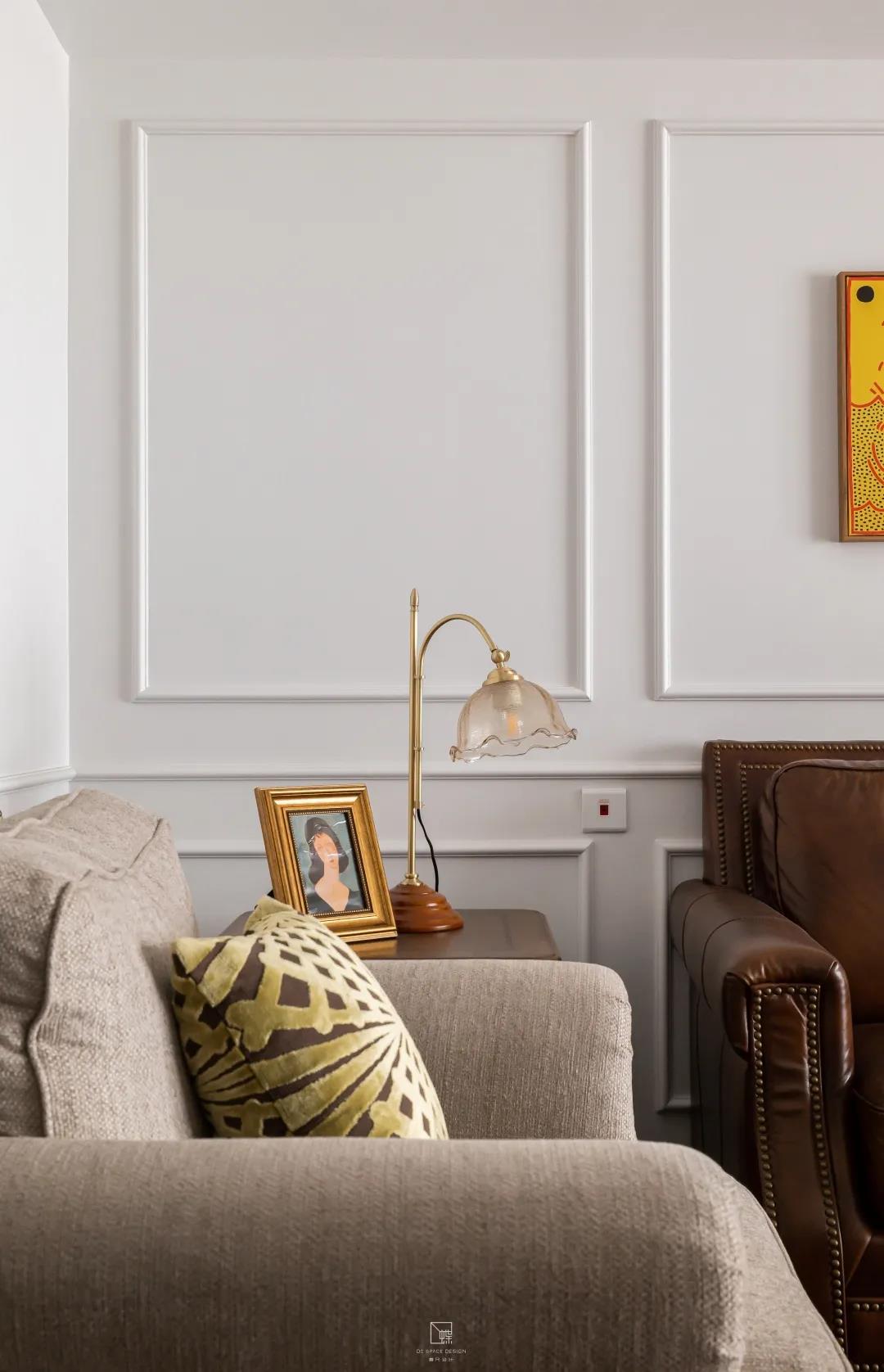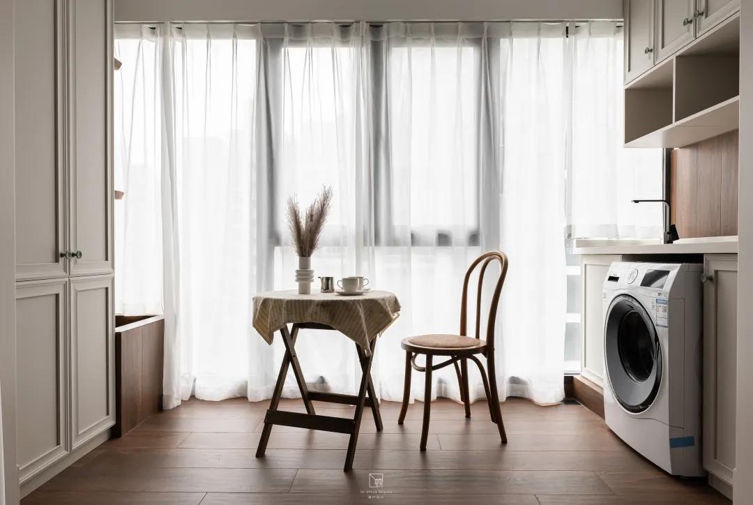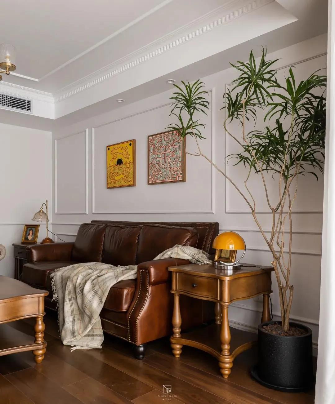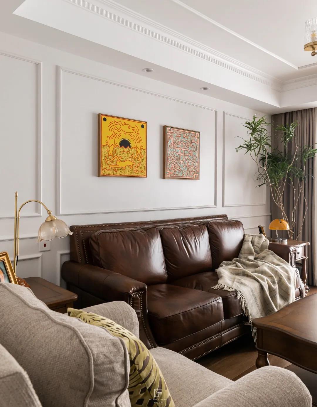 蠟皮的沙發與原木的茶幾電視柜共同展現出復古的氣息,又搭配上布藝的沙發以及沙發背景墻上波普風格的裝飾畫,使得客廳藝術氣息滿滿。陽臺則是讓歲月靜好的休閑區與生活氣息的家務區完美融合。兩邊的儲物柜極大地增加了房屋的儲物空間。