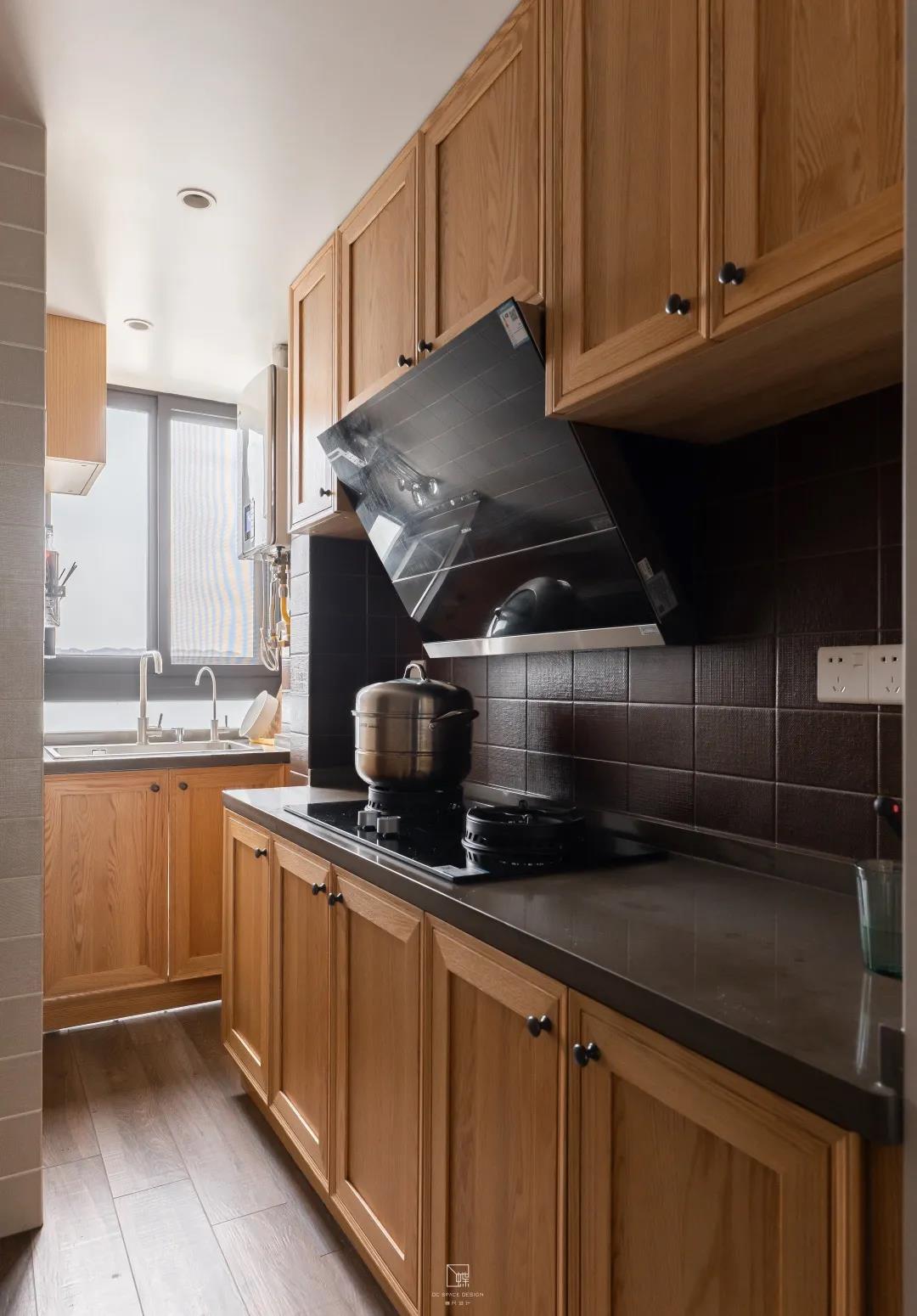 精心設計的巧克力色的背景瓷磚,讓人充滿著食欲,胃口大開!與同色系原木櫥柜之間的相互搭配讓整個廚房渾然天成。廚房的地面和客廳的地面都鋪設同樣的黑胡桃木紋磚,使空間更有延伸感,產生放大空間的效果。