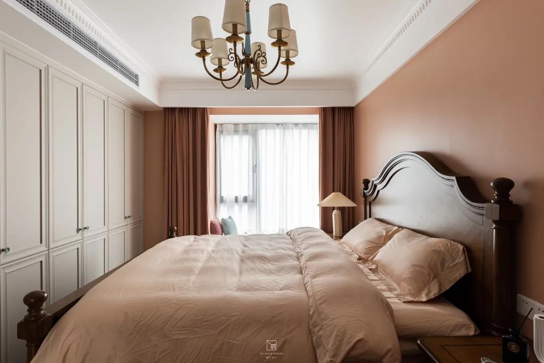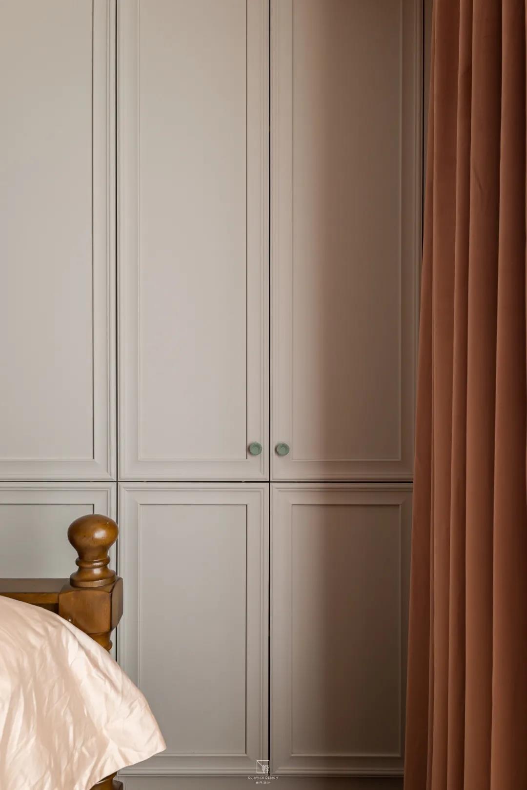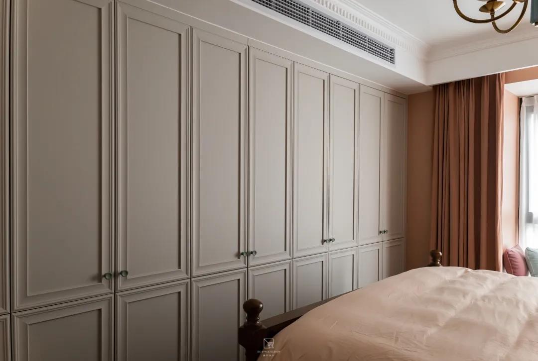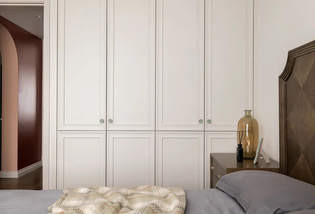 以西柚色為主色調的主臥室,治愈又溫暖,給人一個溫馨又自然的休息空間。兩間臥室的墻面都嵌入一排極簡又精致的置頂嵌入式儲物柜,增加收納。