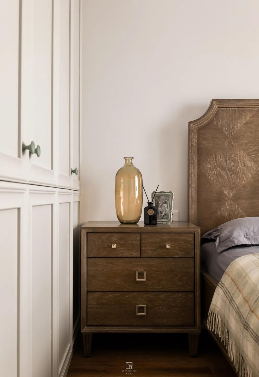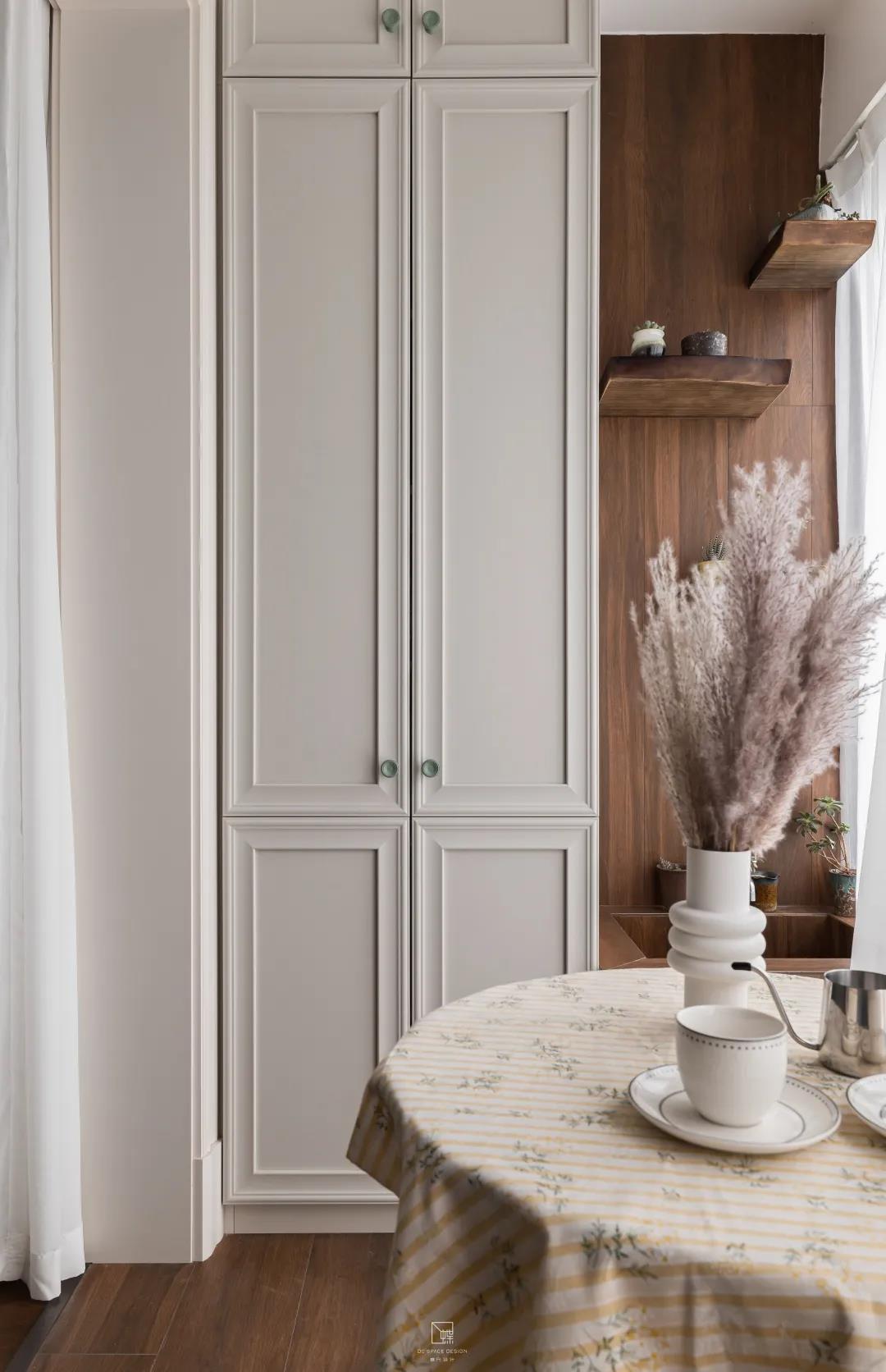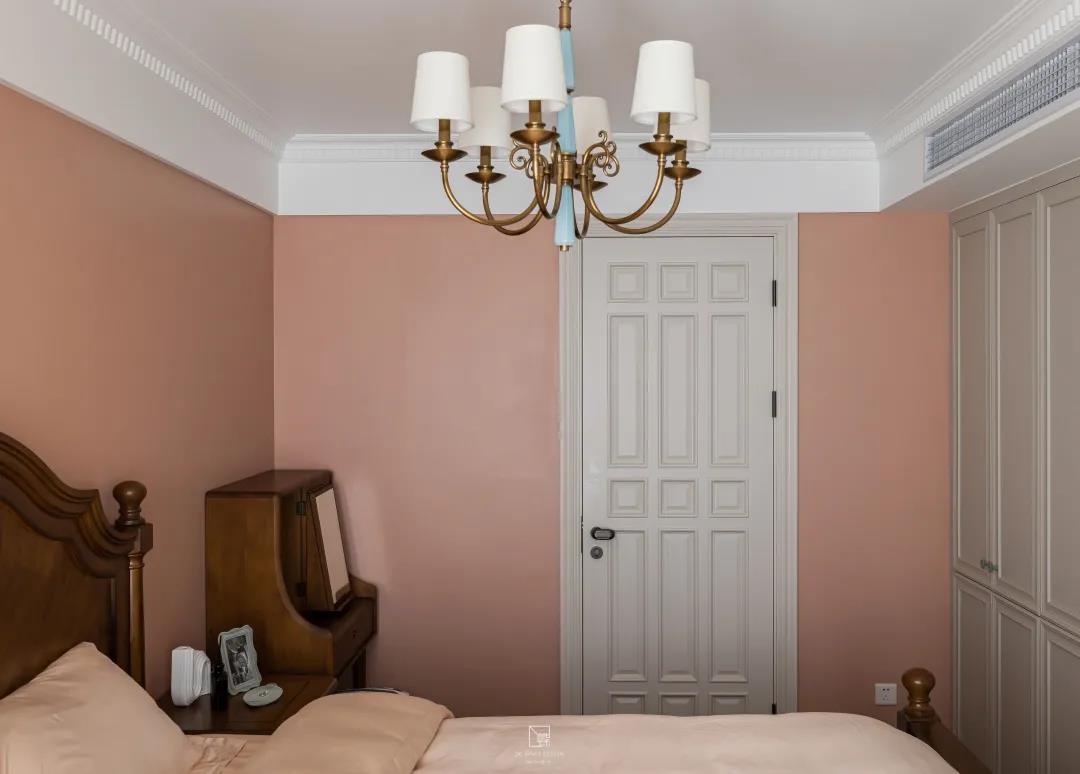 以西柚色為主色調的主臥室,治愈又溫暖,給人一個溫馨又自然的休息空間。兩間臥室的墻面都嵌入一排極簡又精致的置頂嵌入式儲物柜,增加收納。