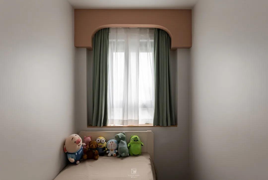 兩房變三房,這多出來的一房就是兒童房了。原本的儲物空間進行改造,打造出一個既溫馨又童趣的兒童房。窗門的特殊設計巧妙地遮住了屋內原有的管道和彎頭 。窗簾的淡草綠色和窗眉的西柚色完美搭配,讓每天都在一片童話中醒來!