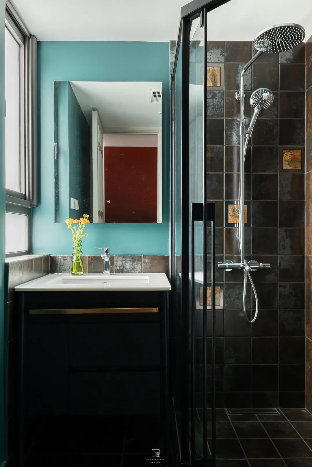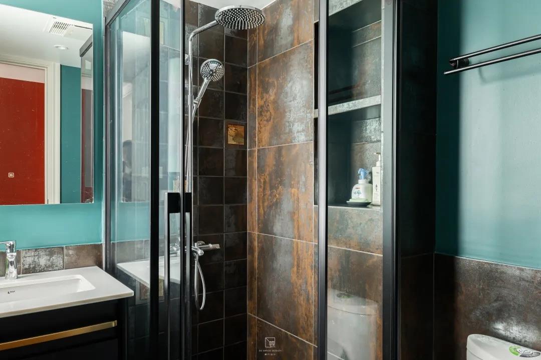 主臥和次臥中間就是這個家的衛生間。衛生間大膽地使用撞色涂料,與玄關的紅色形成一個明顯的對比,凸顯出生活的活力。在衛生間里設計了一個干濕分離的淋浴間。里面墻面上的瓷磚是源于意大利的設計,其靈感是來自戀人在海邊的浪漫邂逅,以及海水沖刷沙灘后的金屬光澤。淋浴房采用定制的鉆石型飛門設計,解決了衛生間面積較小的難題。