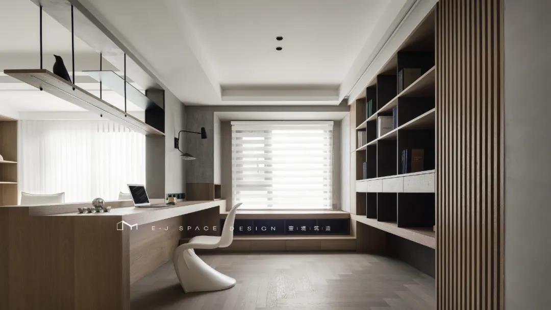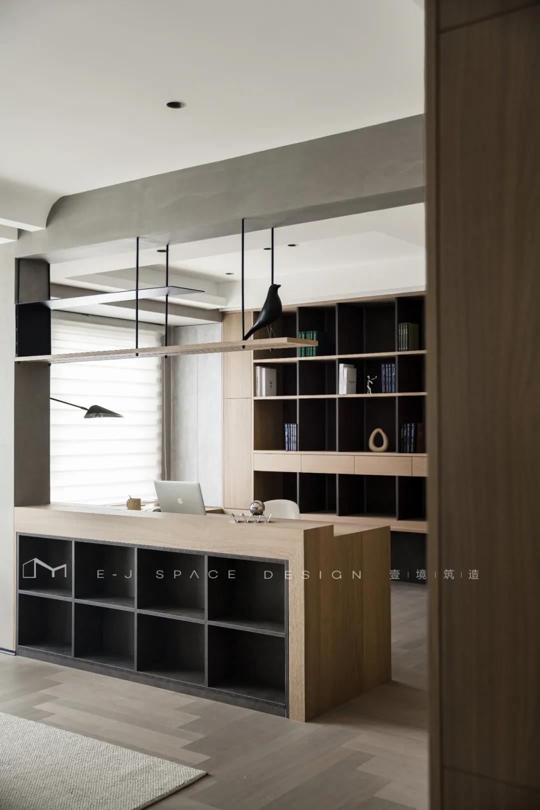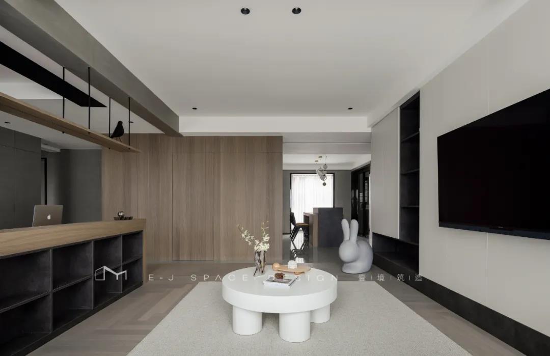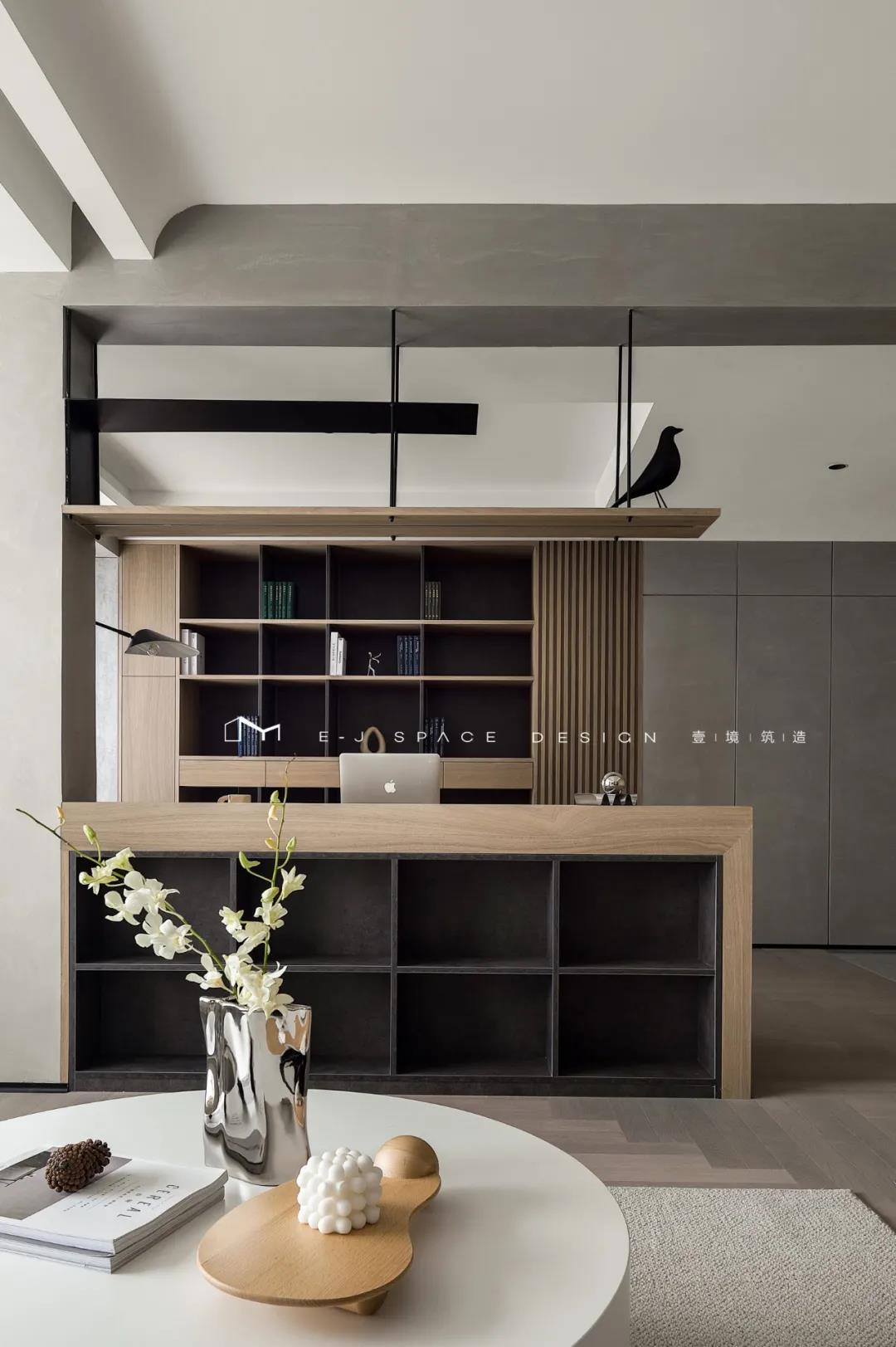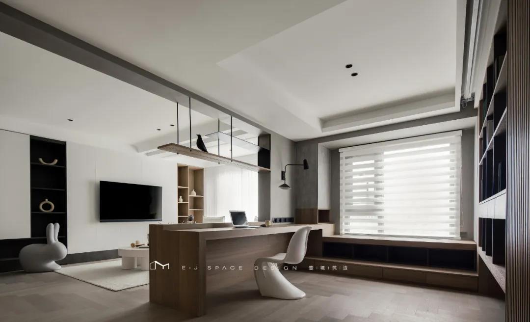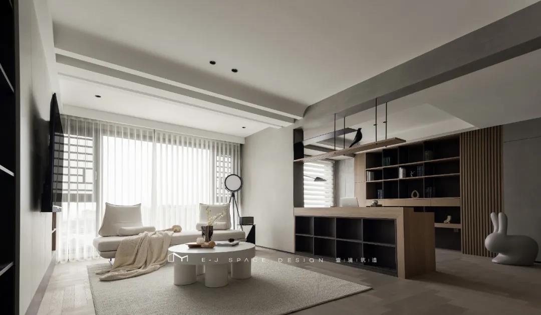客廳取消了傳統(tǒng)的家具擺放,客廳與書房形成新的空間關(guān)系,以書桌做隔斷作用,讓整體空間通透起來,延伸了空間感。