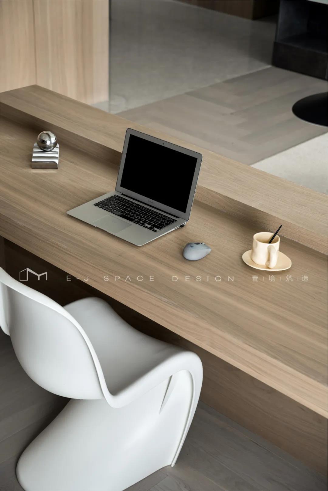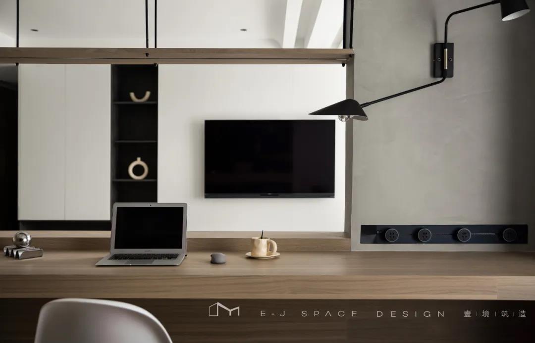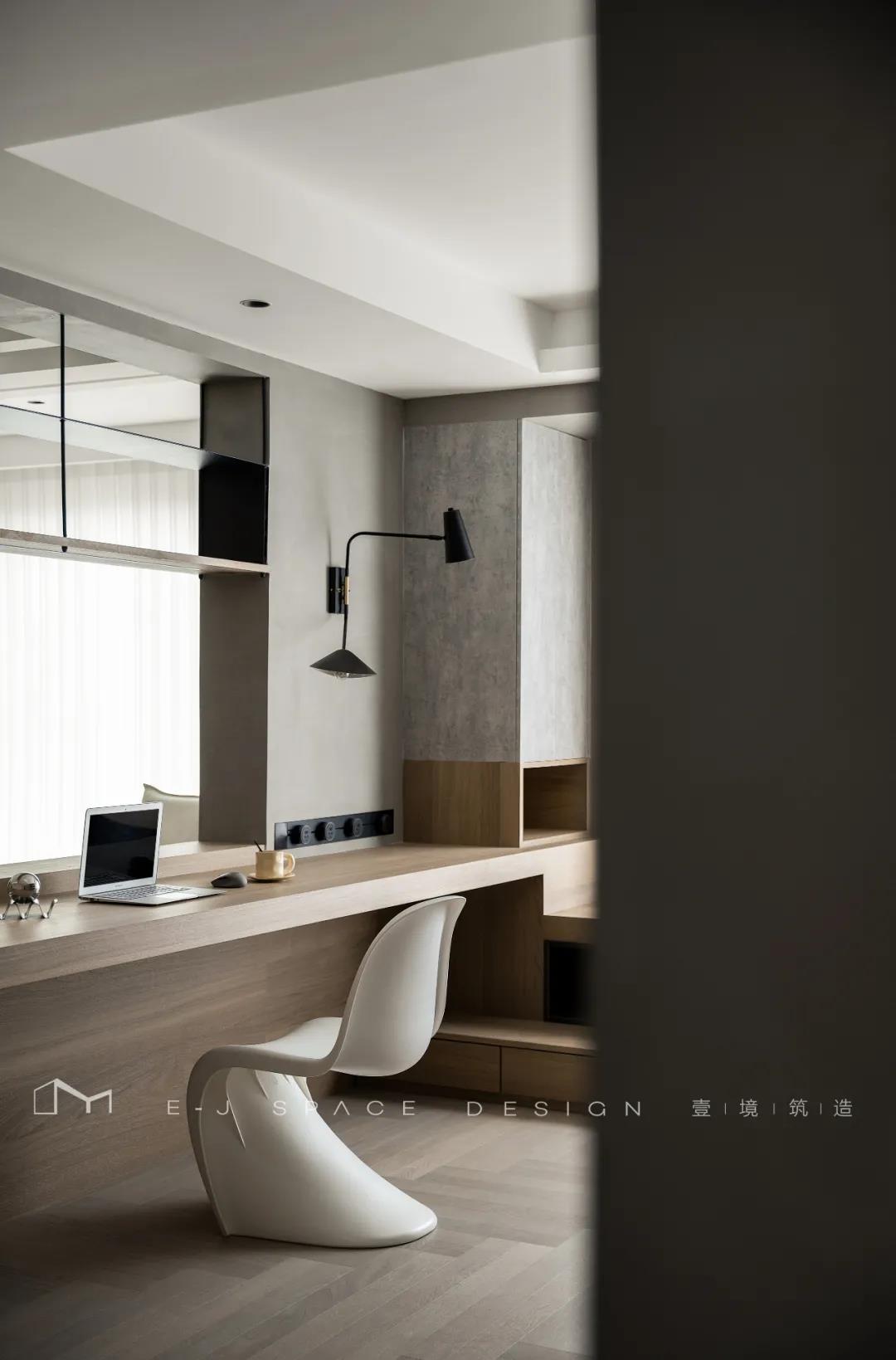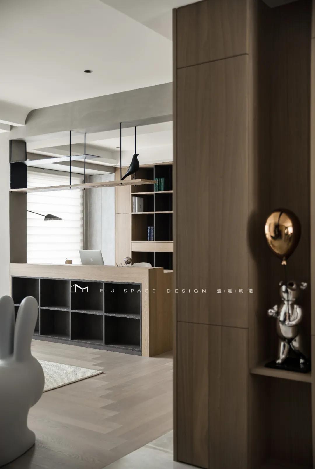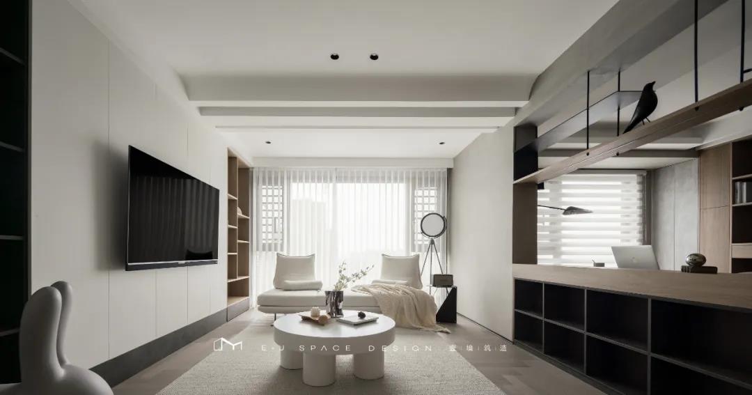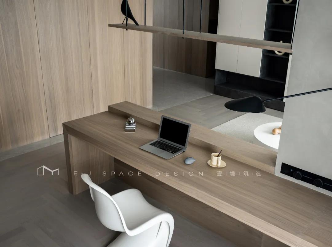 客廳取消了傳統(tǒng)的家具擺放,客廳與書房形成新的空間關(guān)系,以書桌做隔斷作用,讓整體空間通透起來,延伸了空間感。