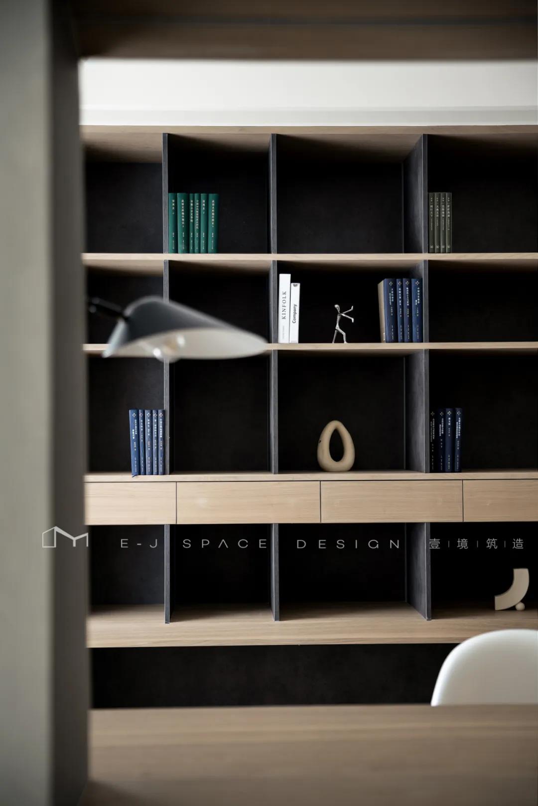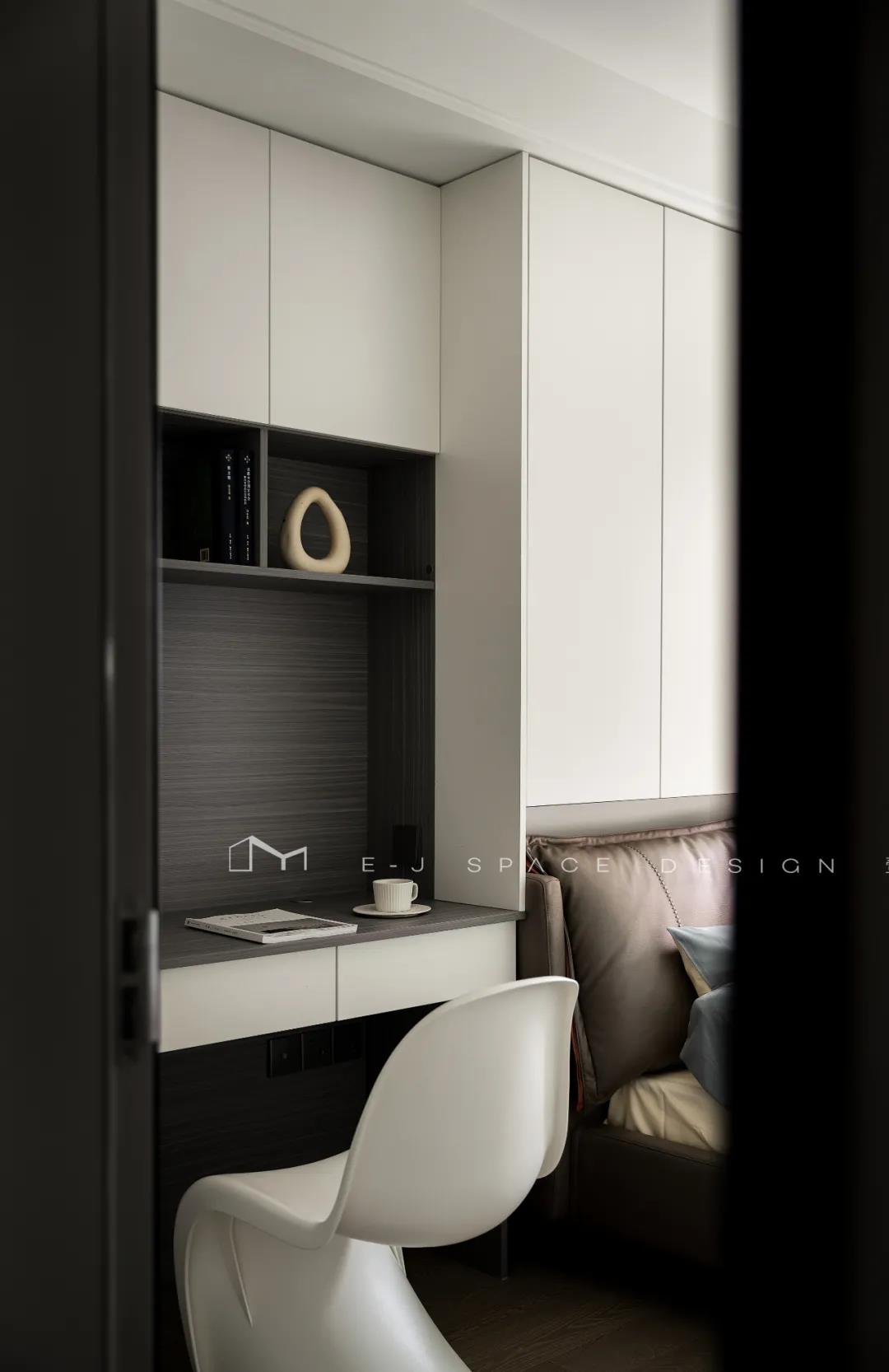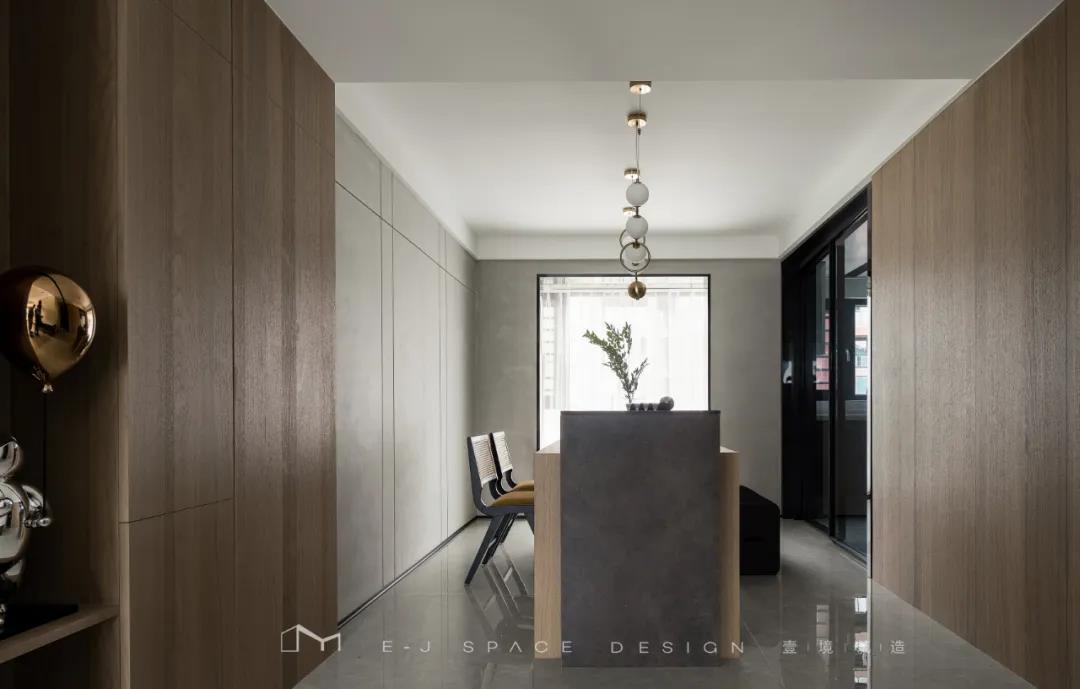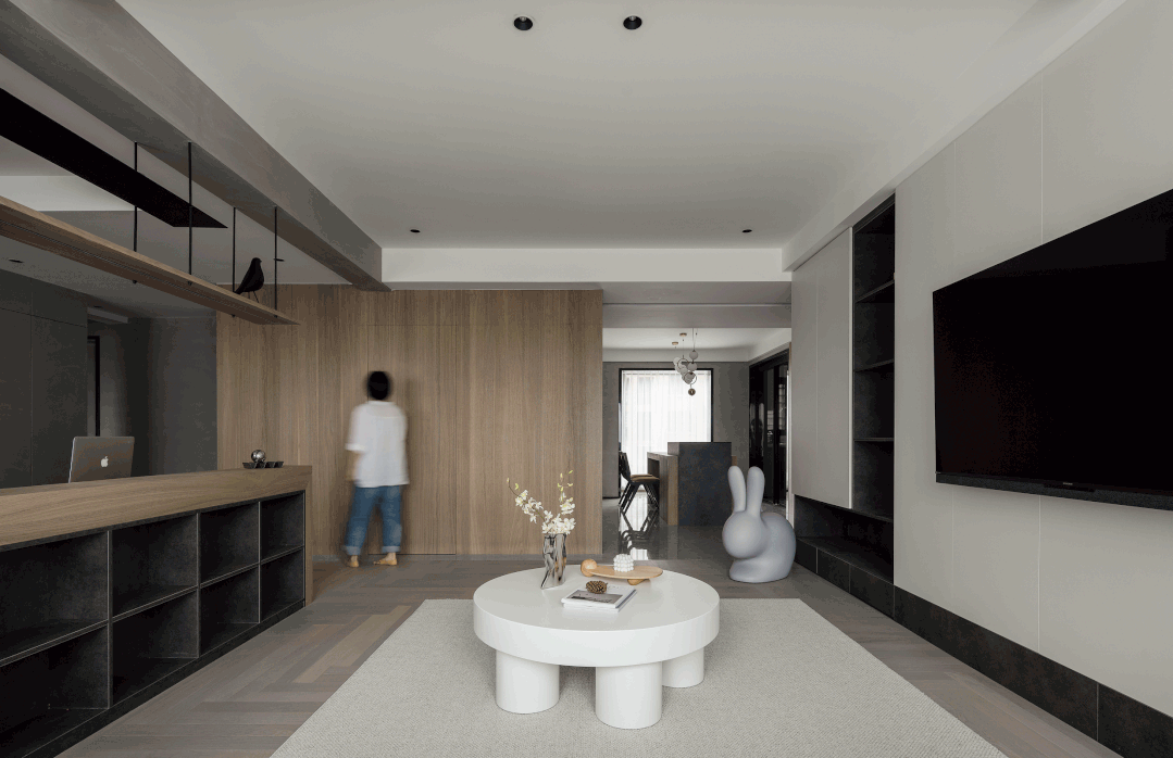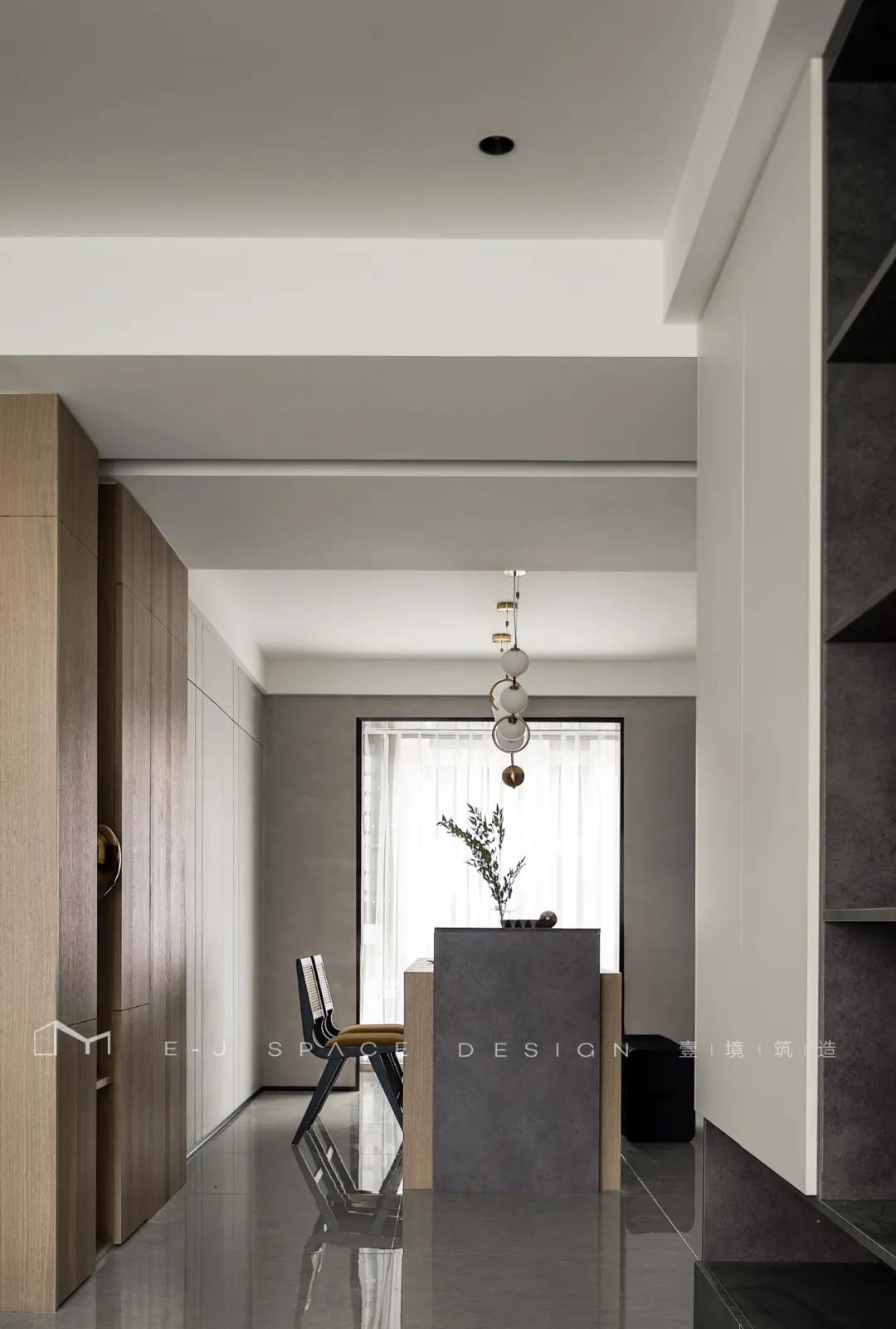 客廳取消了傳統(tǒng)的家具擺放,客廳與書房形成新的空間關(guān)系,以書桌做隔斷作用,讓整體空間通透起來,延伸了空間感。