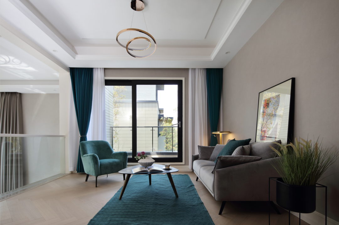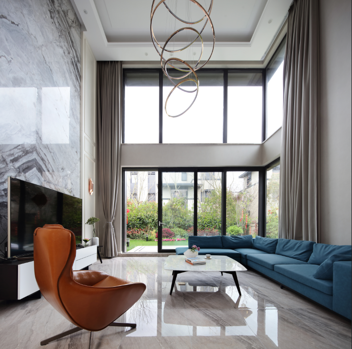 起居室用藍色和白色米色作為主色調(diào),在燈具上加了一些金屬元素,有種輕奢感。