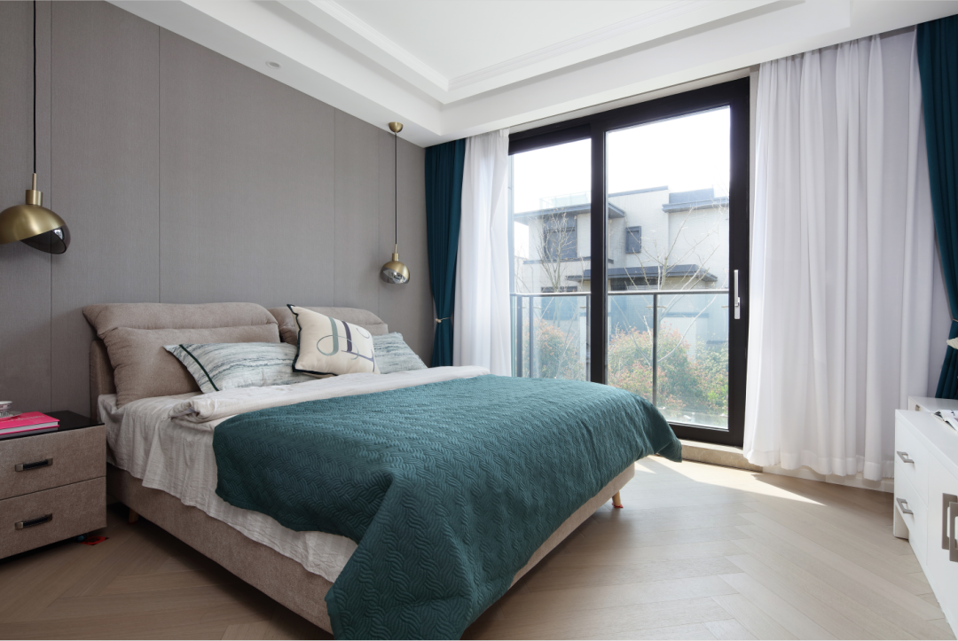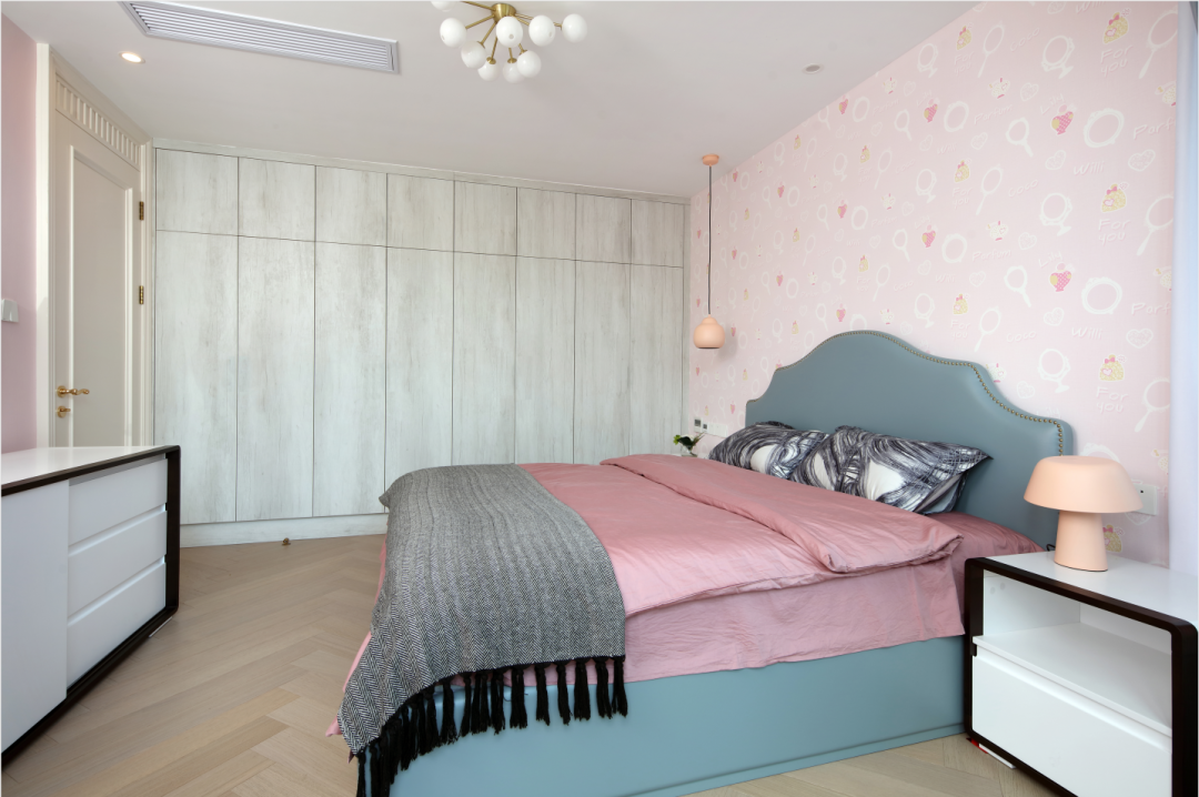 主臥延續(xù)著整體風格色調(diào),陽光照進來,打破單一淺色配藍色的深沉感,給人一種明亮又輕快的感覺,金屬加黑色拼色吊燈,塑造出一點復古的味道~