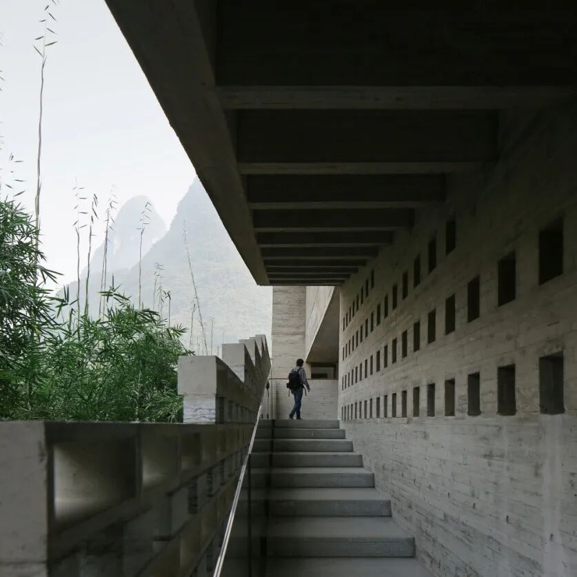 在酒店落成之后,所有來到這里的人都可以在漓江上回望整個酒店建筑群,能夠看到老糖廠的磚墻,也能看到遠處的新建筑,混凝土上面的斑駁讓新的房子和老的房子更容易連接一起,整個建筑也與周邊山體的巖石產(chǎn)生著某種非常微妙的關系。