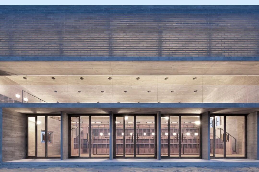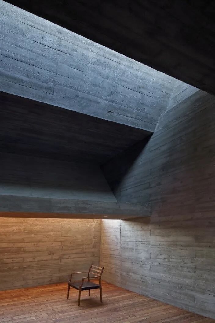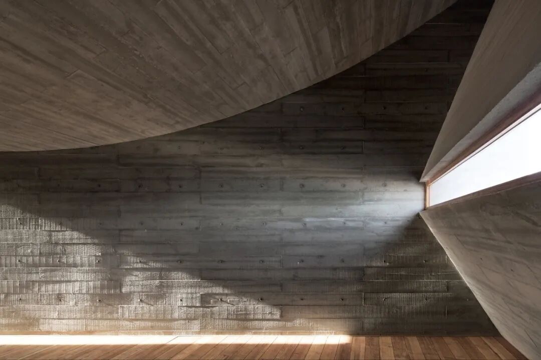 整個建筑的材料是混凝土,但建筑師董功用了一種特殊的模板,整個墻上有清晰的澆筑混凝土時留下的木頭肌理,在某種層面上揭示了施工過程中的一些程序,而且給材料本身帶來了質(zhì)感,創(chuàng)造了更親密的材料和人的關系,尤其是在平行的光線下,木頭的肌理會被光放大到一個最生動的狀態(tài)。