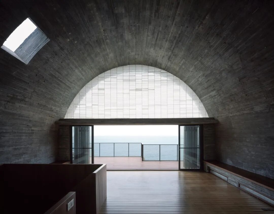 建筑二層下凹的曲線反上去在屋頂上是一個像船一樣的空間平臺,可以從樓梯爬上來進入這個平臺,雖然下凹的曲線看不到海,但能聽到海的聲音,所以這里可以成為一個聽??臻g。