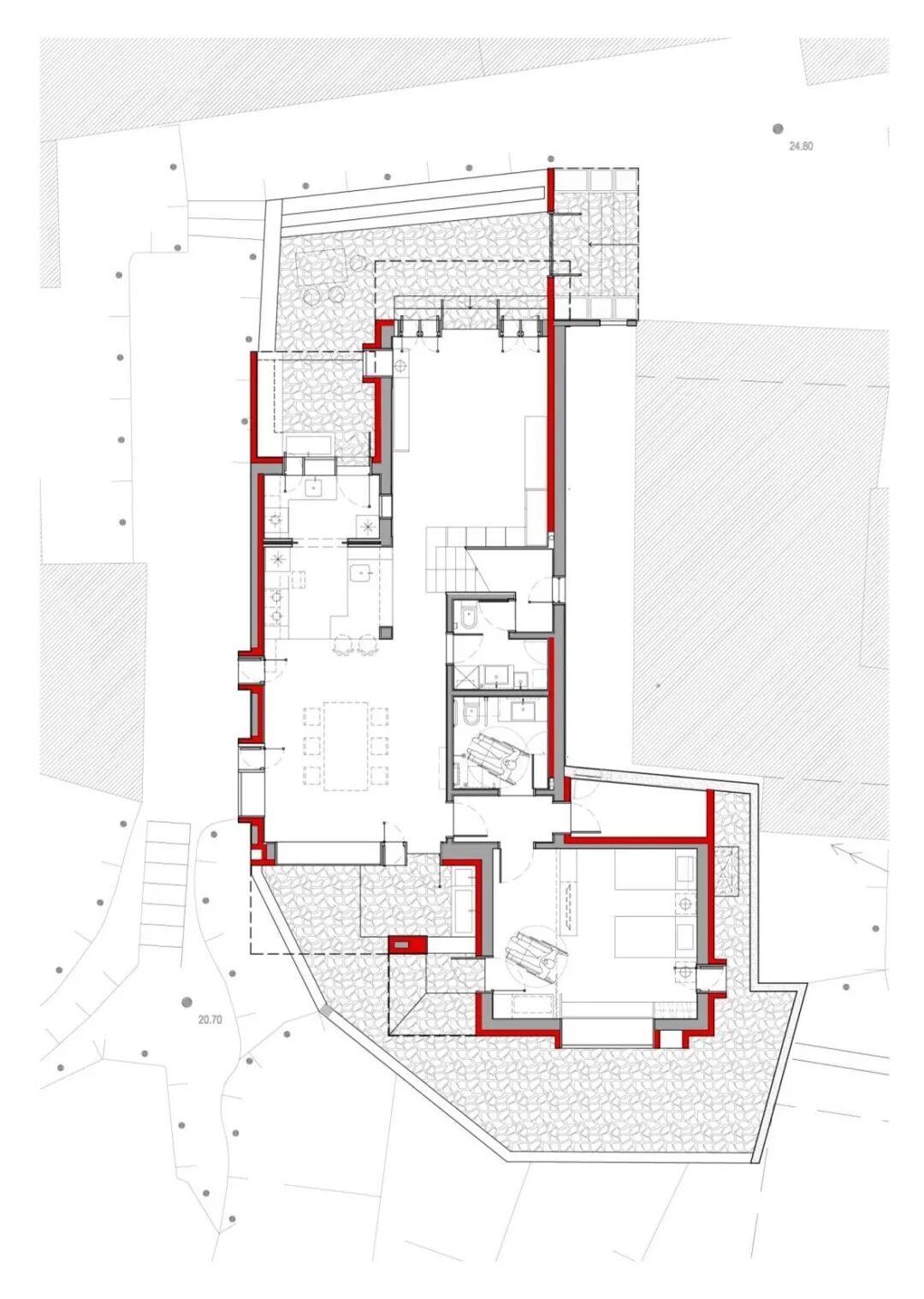 建筑設計最重要的切入點是結(jié)構,因為建筑師先在房屋原本的磚墻結(jié)構上貼了一層新的混凝土,這樣既對原來的磚墻起到加固的作用,能夠支撐新的三層,也為防水帶來了很大的好處。