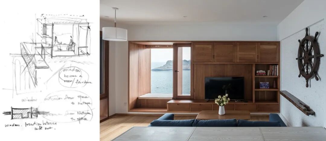 當建筑團隊第一次去看場地時,除了近乎原始的自然海面,海灘上幾乎是空無一物,因此當人站在海灘上,會有一種強烈的不安全感,場地上有一間漁民打魚的小房子,這給了建筑師董功靈感的來源——抽象的建筑和海之間的關系,房子若干個窗戶沖著海,打開窗可以看到遠處海平線被窗戶所限定,而遠處的海就像是掛在墻上的幾張畫一樣。