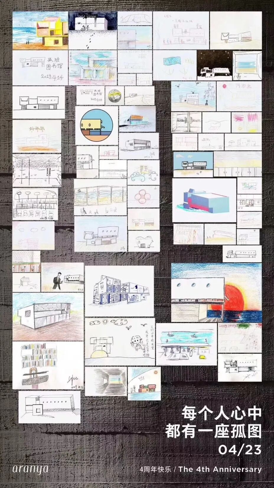 圖書館建成4周年時,運營方收集了參觀者和當?shù)鼐用癞嫷男哪恐械膱D書館并拼成了明信片,可以看到有許多人愿意去描繪這個空間,這整個經(jīng)歷對于建筑師來說是非常奇妙的體驗,一個400平米左右的小空間變成帶有豐富使用方式和公共色彩的空間,這是建筑師董功事先沒有料想到的事情。