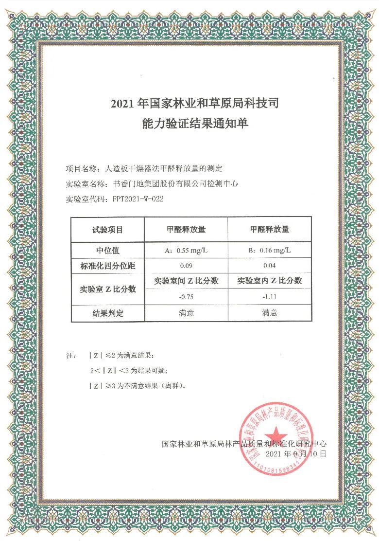 書香門地集團檢測中心參加由國家林業和草原局林產品質量和標準化研究中心組織的、國家人造板與木竹制品質量監督檢驗中心承辦的人造板表面耐磨、甲醛釋放量和靜曲強度3項檢測項目的能力驗證,均獲得滿意結果。