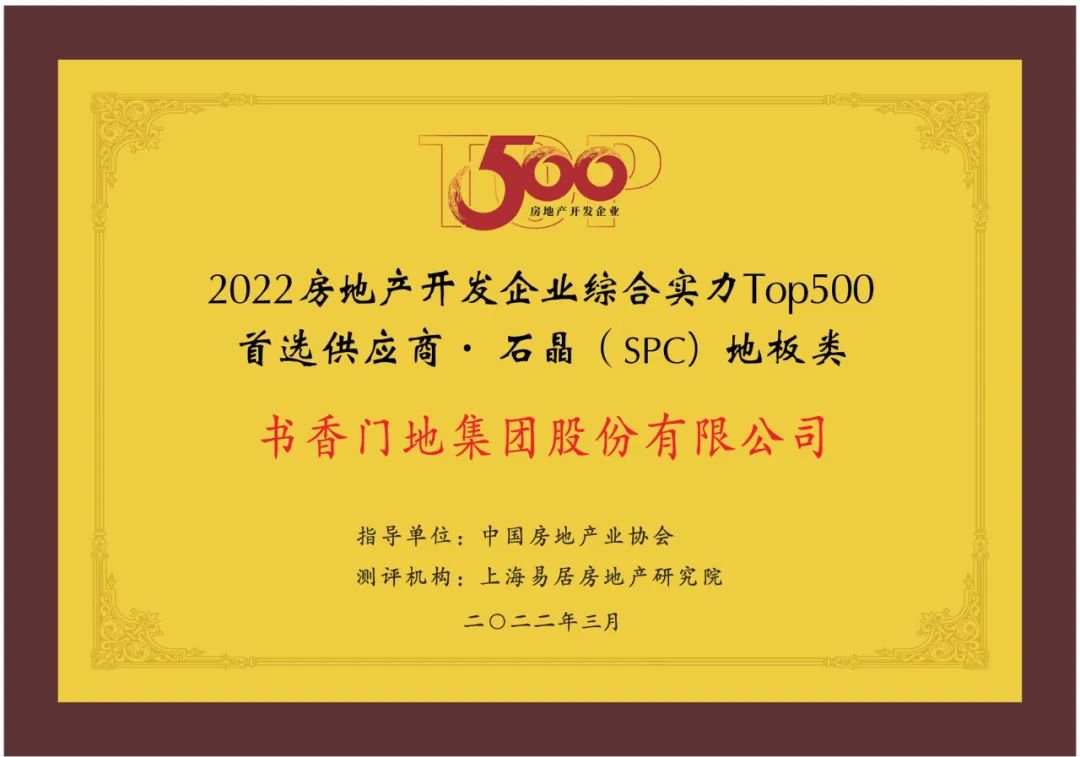 3月29日,2022 中國房地產(chǎn)TOP500 測(cè)評(píng)成果發(fā)布會(huì)暨房地產(chǎn)高峰論壇在北京召開,大會(huì)隆重揭曉系列測(cè)評(píng)榜單及獎(jiǎng)項(xiàng)。書香門地集團(tuán)憑借突出的綜合實(shí)力,榮獲“2022房地產(chǎn)開發(fā)企業(yè)綜合實(shí)力TOP500首選供應(yīng)商·地板類十佳品牌”、“2022房地產(chǎn)開發(fā)綜合實(shí)力TOP500優(yōu)選高端物業(yè)配套地板品牌”、“2022房地產(chǎn)開發(fā)綜合實(shí)力TOP500首選供應(yīng)商·石晶(SPC)地板類十佳品牌”三項(xiàng)大獎(jiǎng)。
