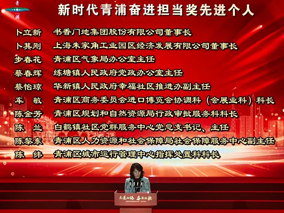 青浦區(qū)委副書記、區(qū)長楊小菁宣讀《中共青浦區(qū)委 青浦區(qū)人民政府關(guān)于表彰2022年度“新時(shí)代青浦奮進(jìn)擔(dān)當(dāng)獎(jiǎng)”先進(jìn)集體和先進(jìn)個(gè)人的決定》,表彰以卜立新為代表的新時(shí)代青浦奮進(jìn)擔(dān)當(dāng)獎(jiǎng)先進(jìn)集體和個(gè)人。