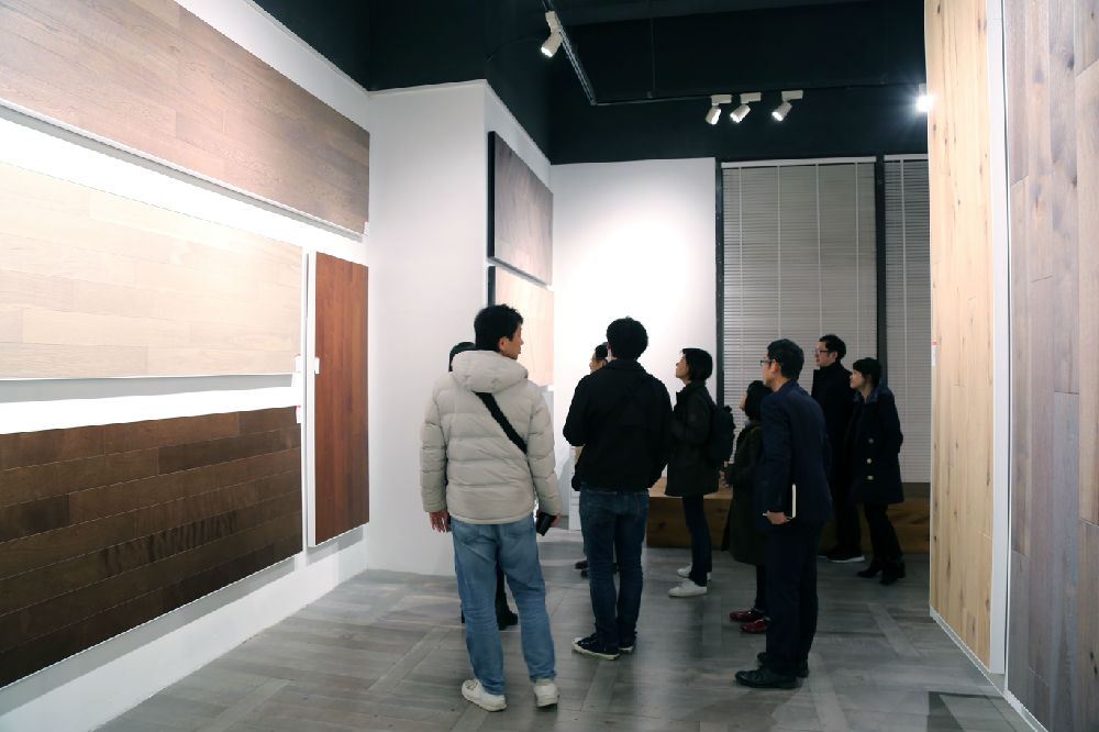 卜立江作為書香門地美學(xué)地板產(chǎn)品以及展廳展陳的總規(guī)劃師,帶領(lǐng)佐藤善彥一行走進(jìn)美學(xué)地板展廳,并詳細(xì)講解了產(chǎn)品的設(shè)計(jì)理念。近千款美學(xué)地板如藝術(shù)畫作般淋漓盡致地呈現(xiàn)在佐藤善彥的眼前時(shí),感慨“書香門地對表皮木質(zhì)材料的處理藝術(shù)和創(chuàng)作水平讓人驚嘆,完全可以跳出地板,賦予設(shè)計(jì)師更廣闊的想象空間”,“這些不是地板,是藝術(shù)品,我真想把它們帶走。喜愛之情,溢于言表。